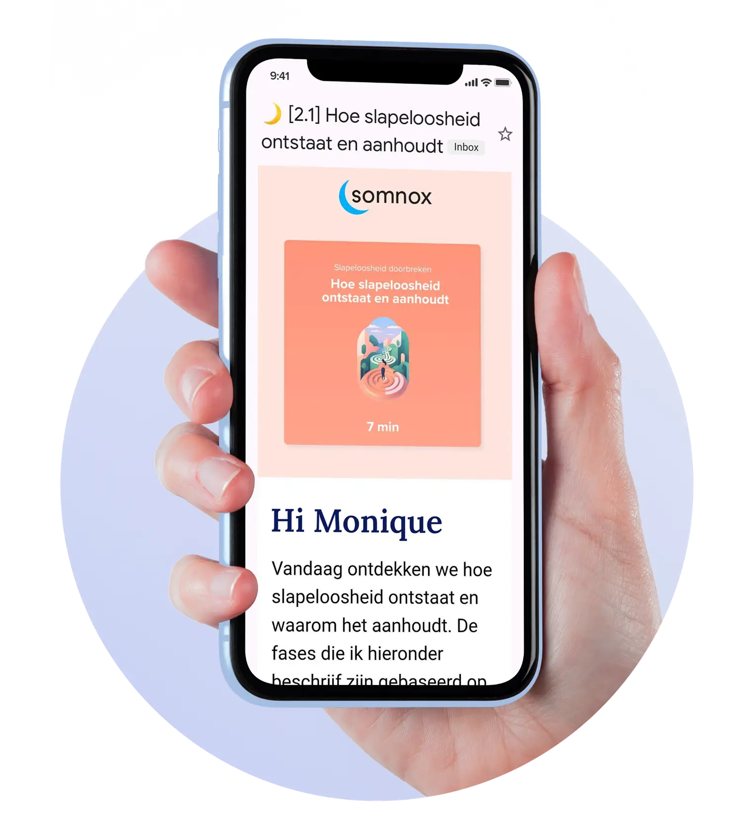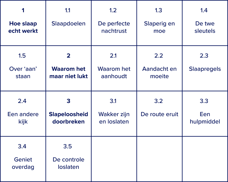 ''Veel gelezen en zelfs een slaapcursus gevolgd i.v.m. slaapproblemen, maar ik vind deze lessen zeer interessant. Een meer realistische benadering en een nieuw standpunt wat betreft het niet kunnen slapen. Het legt geen druk en legt ook geen slaaprestrictie op, wat heel fijn is."